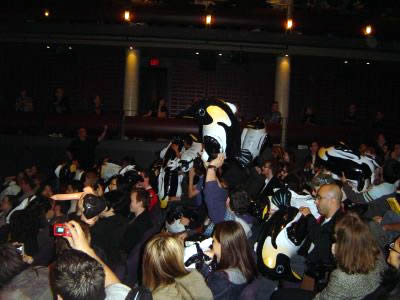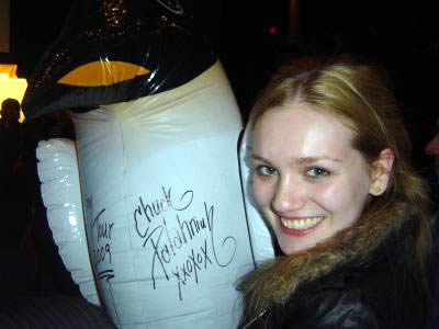 And then the fun really began. Over the course of the evening, Chuck entertained us with his hilarious retellings of “fairy tales” in Pygmy speak (read one of them here ); he was interrupted by a “sext” from Margaret Atwood (he assured the crowd that “boys only tease the writers they like”); and he whipped 200 inflatable penguins at us (plus one lone naked inflatable man). Seriously. The crowd lapped it up.